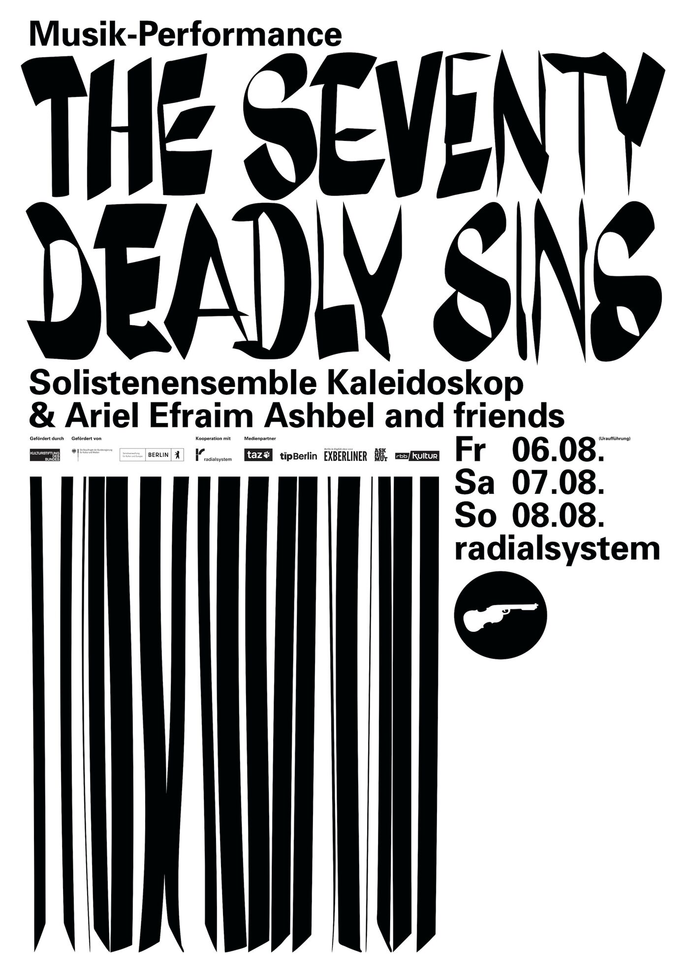 From Barry Lyndon to Star Wars, from Ornette Coleman to Madonna, from traditional Jewish music to Nicki Minaj, from Dick Tracy to Jacques Derrida: The Seventy Deadly Sins is a wild ride between sense, sin, senses and sensuality, a musical performance of smallest compositions and large musical forms, cultural references, quotations, images, outfits and gestures. Solistenensemble Kaleidoskop teams up for the first time with artist and director Ariel Efraim Ashbel and shows their particularly playful side for this world premiere. The Seventy Deadly Sins is shown at radialsystem Berlin from August 6 to 8.