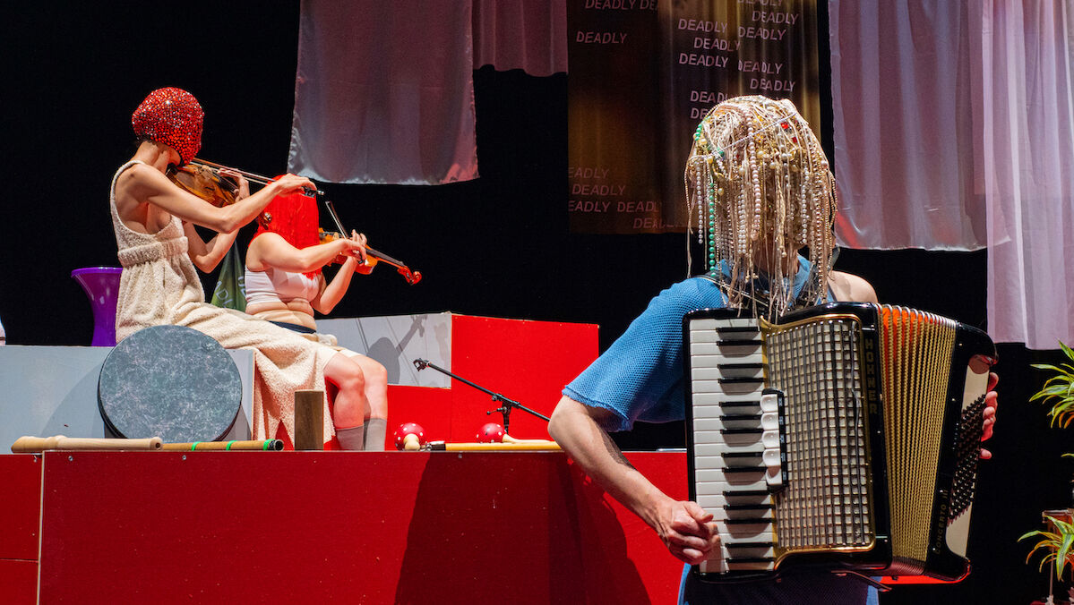 The Seventy Deadly Sins unfolds into ever-changing, unexpected scenes defined by unpredictable dramaturgy and absurdist humor: A potted plant taken for a walk, a tearful flag march, a game of hide-and-seek behind the double bass, a brief baroque dance that spills into an opulent Broadway number. The Seventy Deadly Sins paints whimsical images that linger in the mind and are woven into a new musical composition by composer Ethan Braun. Braun, who has already worked with the ensemble several times since 2020 as an Associated Artist, bounces back and forth in almost operetta-like fashion between different musical references and forms and dives into ever new emotional worlds. The musicians oscillate between operatic, symphonic grandeur and a light-footed wit. They also use instruments that are foreign to them – the string instruments are joined by harmonicas, recorders, accordions and omnichords (electronic harps from the 1980s). Ethan Braun’s compositions develop a fascinating bounce in their sometimes daring stylistic leaps.