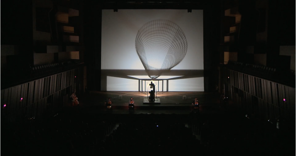 We present a world premiere with a work for string orchestra and robot choreography white radiation. LichtKlang-Abstastungen - composed by Michael Reudenbach, choreographed and illuminated by Joachim Fleischer.