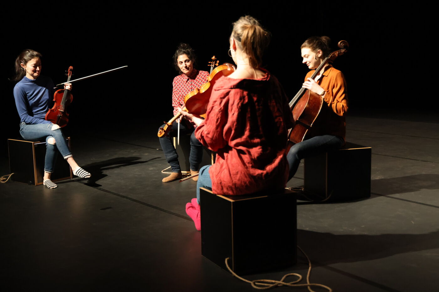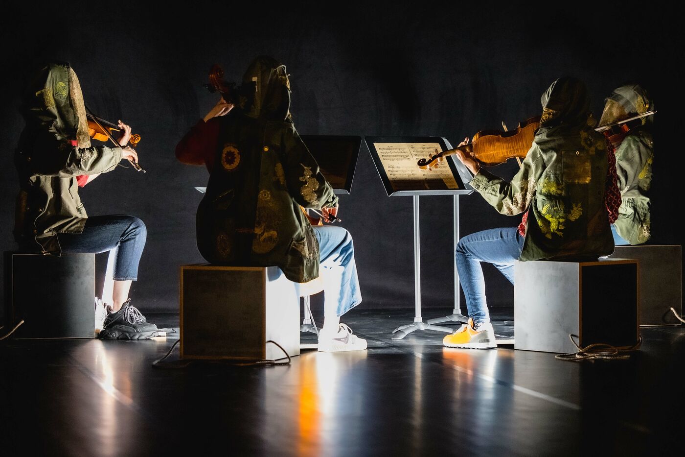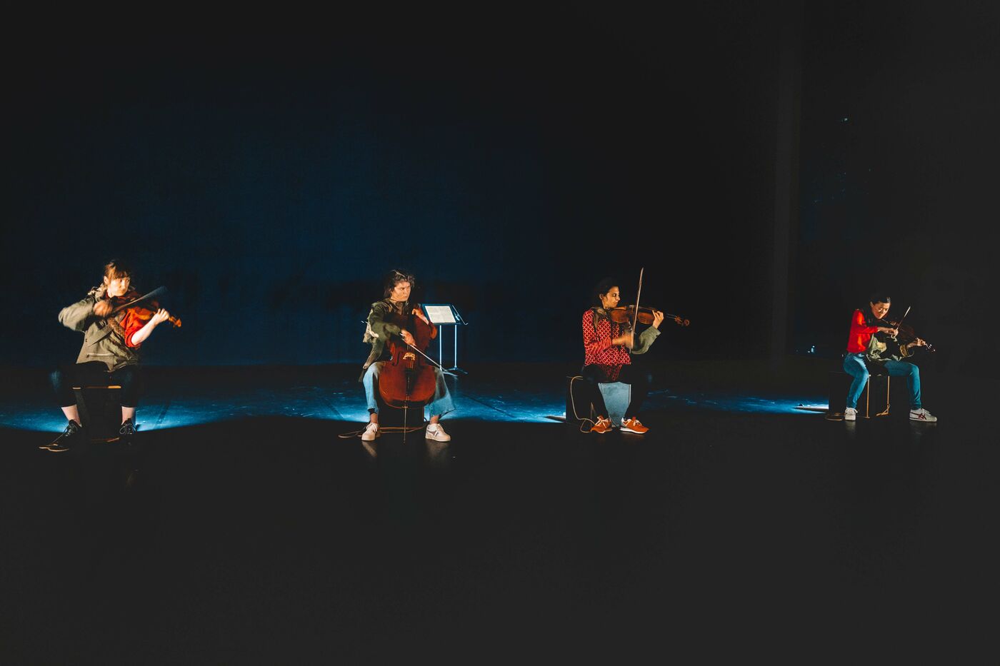 Die Partitur, die genauestens eingehalten wird und jeden Atemzug, jede Fingerbewegung und jede Gliedmaßenbewegung steuert, fungiert als Vermittler zwischen der Sprache der Noten und der Sprache der Körper - zwischen den Anliegen Schostakowitschs und denen der Gegenwart. In diesem Wechselspiel zwischen Notenlinien und Gesten, Solo und Quartett, Stille und dem Rhythmus, der sie verbindet, entfaltet sich eine subtile Choreografie, die die Musik ebenso sichtbar wie die Bewegung hörbar macht.