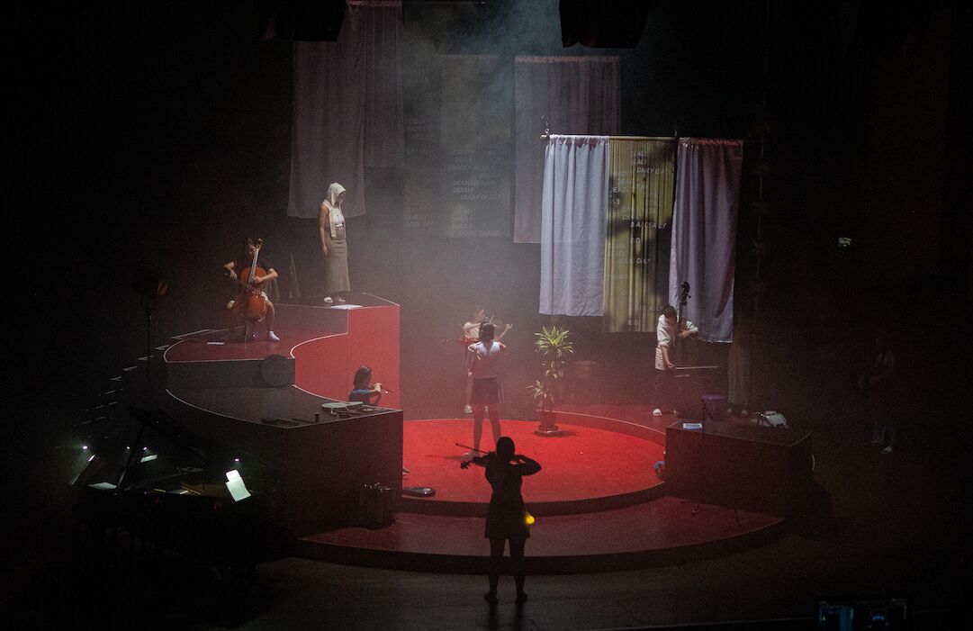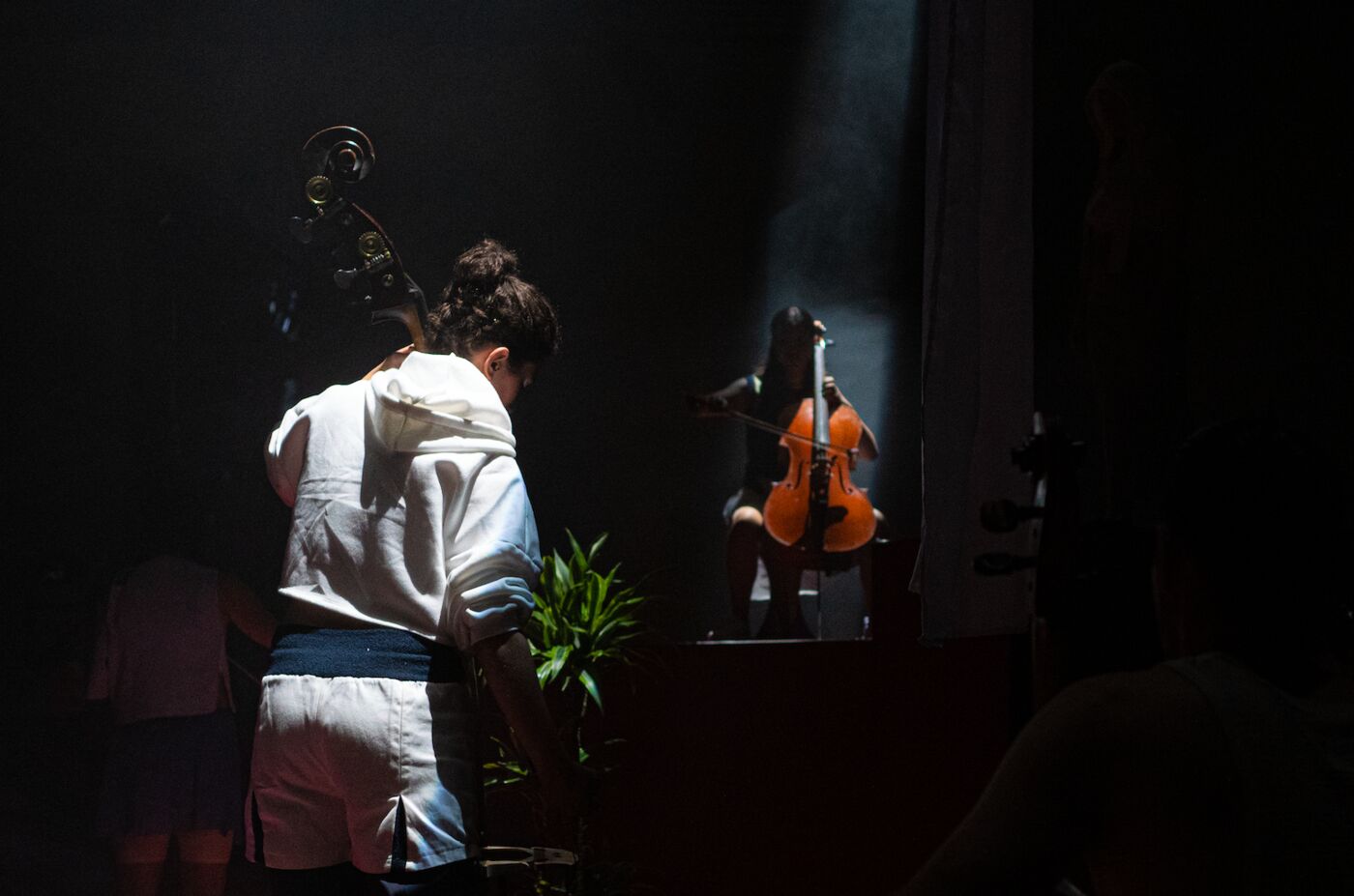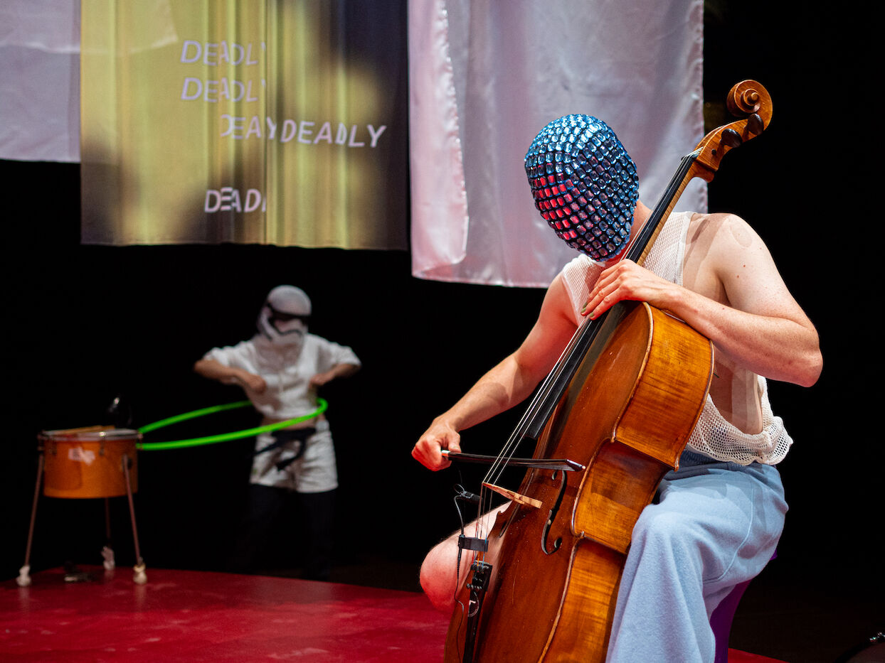The Seventy Deadly Sins entfaltet sich in immer wieder neue, ungeahnte Szenen, die von einer unvorhersehbaren Dramaturgie und einem absurden Humor bestimmt sind: Eine Topfpflanze die Gassi geführt wird, ein tränenreicher Flaggenmarsch, ein Versteckspiel hinter dem Kontrabass, ein kurzes barockes Tänzchen, das in eine opulente Broadway-Nummer ausufert. The Seventy Deadly Sins zeichnet skurrile Bilder, die im Gedächtnis bleiben und vom Komponisten Ethan Braun zu einer neuen Musik-Komposition verwoben werden. Braun, der als Associated Artist vom Solistenensemble Kaleidoskop seit 2020 bereits mehrfach mit dem Ensemble zusammengearbeitet hat, hüpft nahezu Operetten-haft stetig zwischen verschiedenen musikalischen Referenzen und Formen hin und her und taucht in immer neue Gefühlswelten. Dabei changieren die Musiker*innen zwischen opernhafter, symphonischer Erhabenheit und einem leichtfüßigen Witz. Sie greifen auch zu ihnen fremden Instrumenten – zu den Streichinstrumenten treten u.a. Mundharmonikas, Blockflöten, Akkordeons und Omnichords (elektronische Harfen aus den 1980ern). Die Kompositionen von Ethan Braun entwickeln in ihren teils waghalsigen stilistischen Wendungen eine faszinierende Sprungkraft.